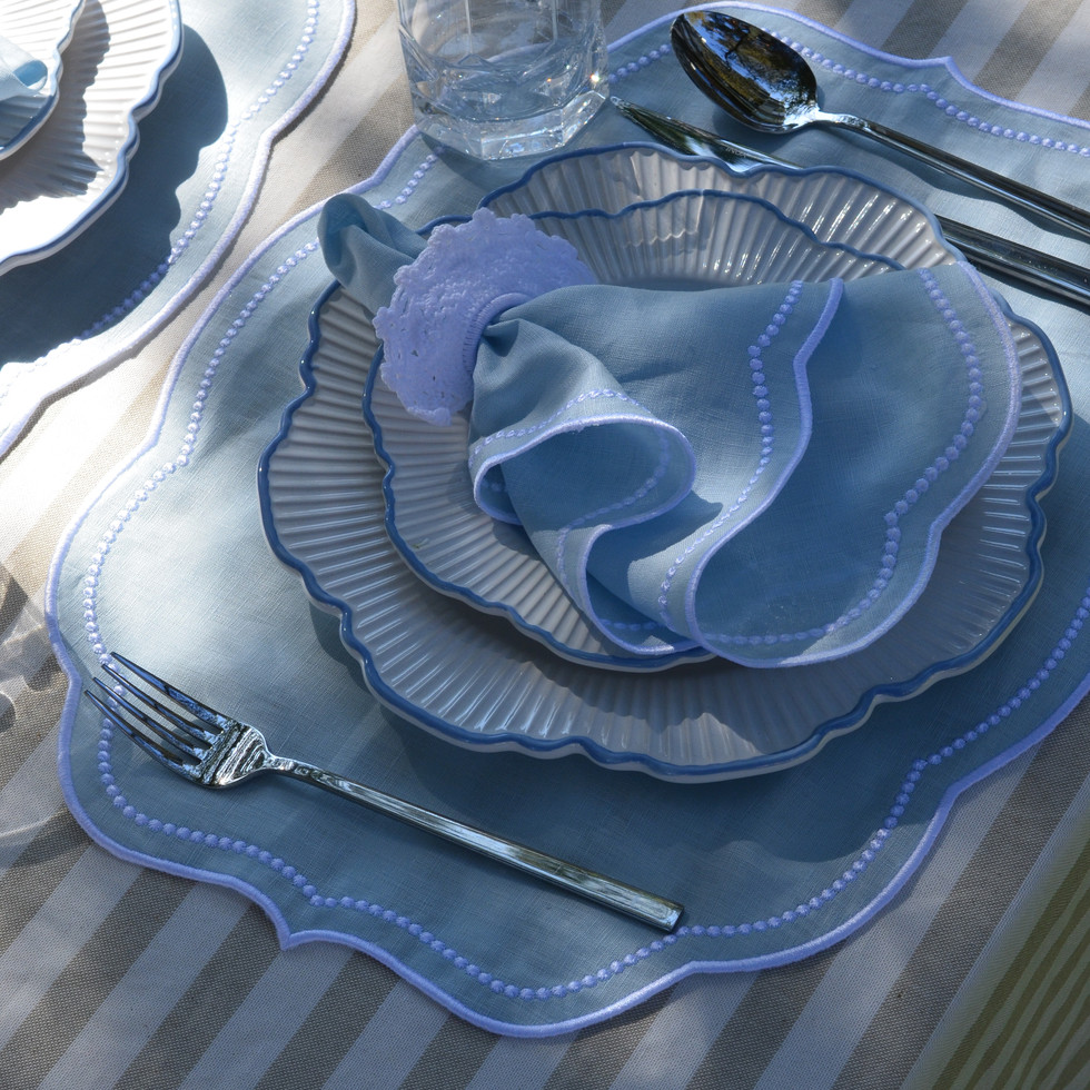 El Set Sophia incluye un mantel individual en forma ovalo en azul claro con delicado borde en ondas y bordado blanco en puntos, acompañado de una servilleta a juego. Su tono sereno y forma fluida lo convierten en un clásico contemporáneo que funciona tanto para una comida especial como para el desayuno de todos los días, e incluso, una cena en el jardin.